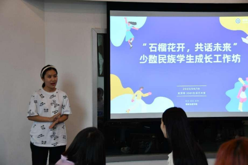 发布时间: 2023-05-24 09:25:13 已阅读:为深入贯彻落实中央民族工作会议精神,铸牢中华民族共同体意识,深化民族团结进步教育,助推少数民族学生更好地成长成才,学院于5月19日下午在17教3301生活艺术室开展“石榴花开,共话未来”少数民族学生成长工作坊,学院党委副书记王晖老师、2022级辅导员曾琪芮老师、高年级少数民族学生代表和2022级少数民族学生参加本次活动,工作坊由2022级辅导员曾琪芮主持。