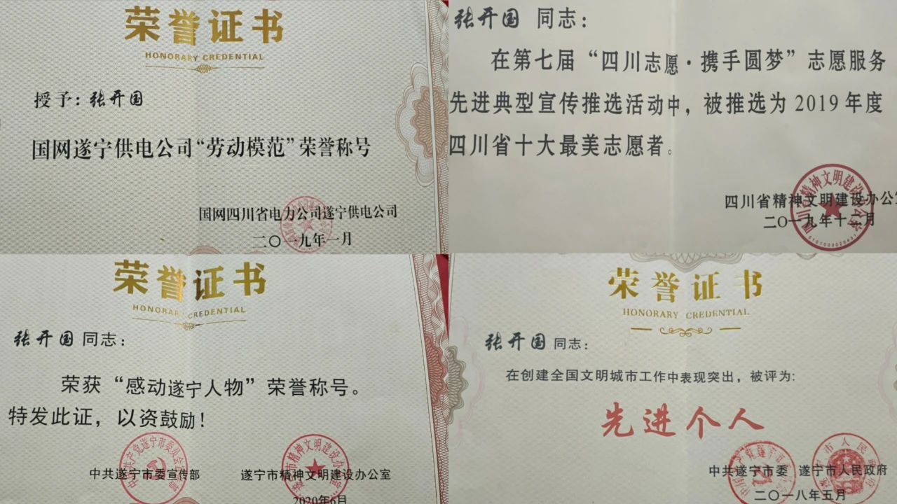 工作之外,张开国力所能及地帮助需要帮助的人,他将需要帮扶的对象逐一建档,时常陪伴和关爱独居老人,为老人家整改线路,与党员服务队共同帮助老人安装天然气、置办电器;资助需要帮助的留守儿童生活与学习、探访慰问抗战老兵……多年来,张开国带领着志愿服务队与19户孤寡老人、残疾人、特困户结队帮扶,帮助了复兴镇167名特困留守学生,同时积极参与老旧小区电力改造等惠民活动,在脱贫攻坚工作中与95户贫困人家对口帮扶。