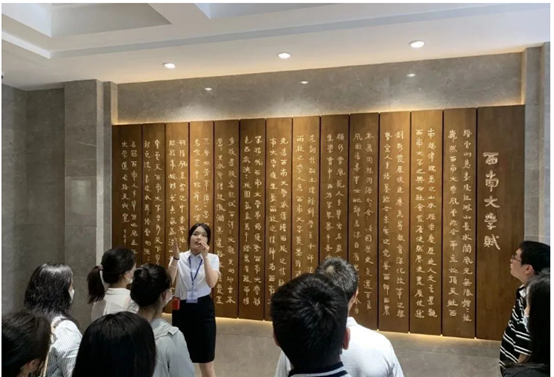 “大家请看,我左手边的前言墙,是一篇《西南大学赋》:‘缙云山麓,嘉陵江畔,山长水阔,风光无限……’整篇赋大气磅礴,读起来朗朗上口,同时也对学校办学110多周年历史进行了高度凝练和概括”在讲解员的解说中,同学们开启了“校史馆”之旅。